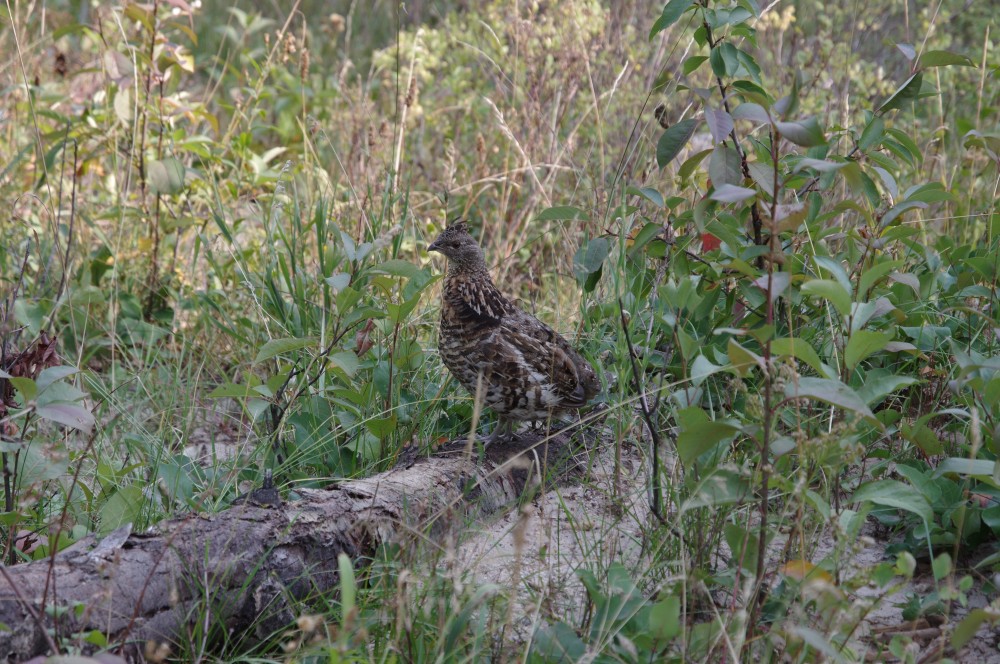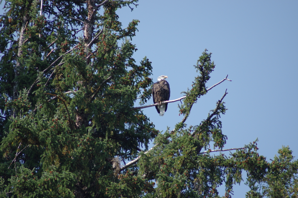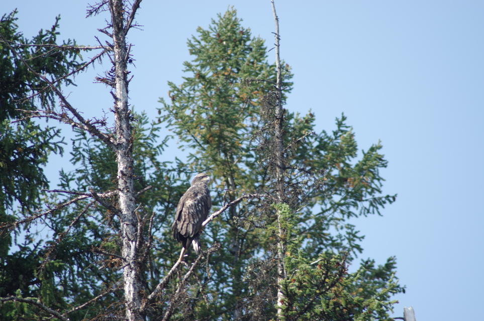 A ptarmigan in the bushes and eagles in the tree tops.