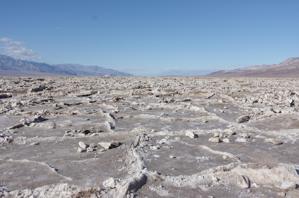 The most amazing part of Death Valley is its diverse landscape. Badwater Basin is one of the representative spots. A large amount of salt has formed hexagonal shapes expanded from the Earth crust. The result is fascinating. It is also one of the most popular tourist attraction in Death Valley.