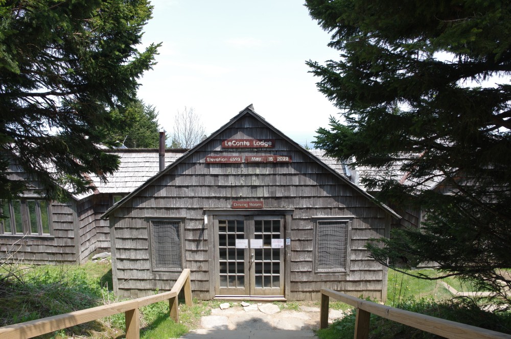 Finally, we arrived at the top of Mount LeConte, where there was a working lodge. A guy asked us to take of photo of him in front of the LeConte Lodge dining room, which has the actual date on it, so he could prove that he did this hike every year on his birthday.